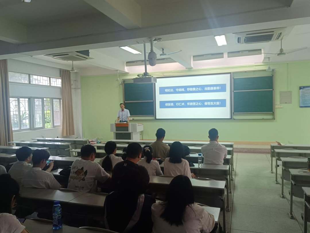 林老师从中央纪律检查的政策法规为切入口,带领毕业生学习相关法律知识,列举了中央纪委国家监委公布全国查处违反中央八项规定精神问题的典型情况,结合福建省、医疗行业、校内外的鲜活案例,从医疗工作、日常言行、人际交往等廉洁相关的问题,增强“底线思维”;同时,林老师提醒全体毕业生,始终保持对法纪法规的“敬畏心”,筑牢思想防线,永不松懈。