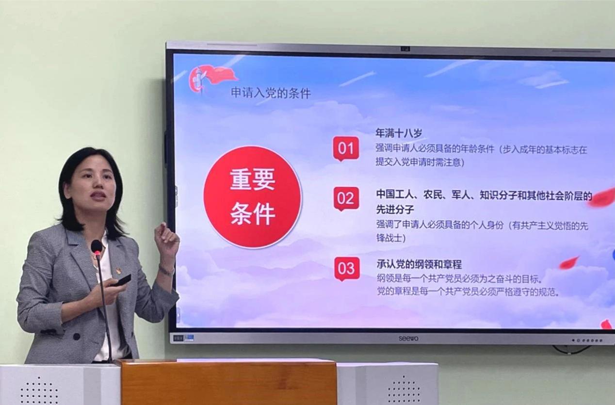 卓彩静副书记以“让信仰点亮人生”为主题分三个部分授课:首先,她从入党是承担新时代青年历史使命的需要、是作为优秀共青团员的必然追求以及是有志青年理想和信仰的归宿三个方面详细阐述了如何树立正确的入党动机;第二部分,她详细介绍了申请入党的条件和入党程序,明确了同学们在入党过程中所应具备的素质能力,并鼓励同学们时刻以党员标准要求自己;第三部分,她从入党申请书书写格式、书写内容等方面,对同学进行悉心指导。通过卓彩静副书记生动详细的阐述,帮助同学们端正了入党动机,树立了入党信念,坚定了入党决心。