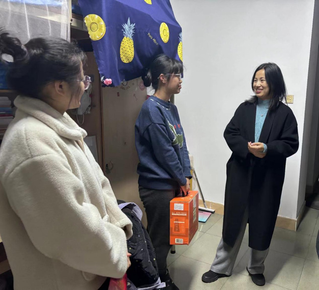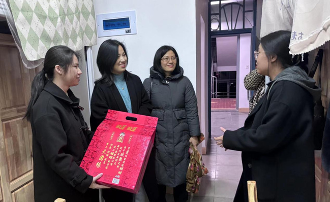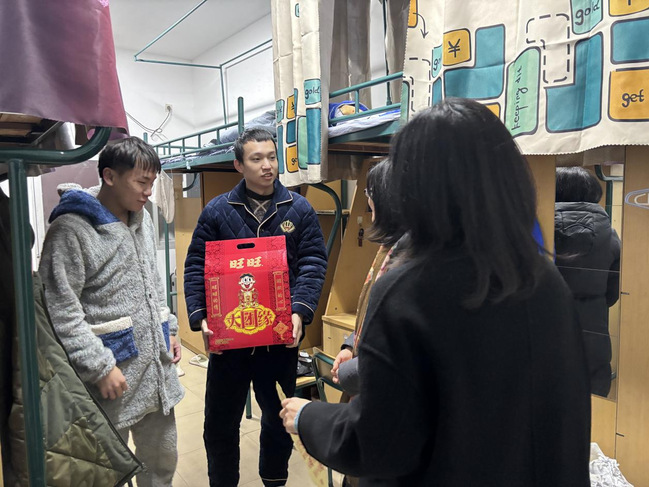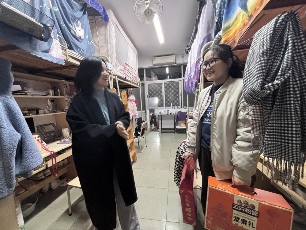 走访过程,卓彩静副书记代表公司全体领导老师为同学们送上美好祝福和新春大礼包,询问同学们的实习工作、就业招聘、假期安排,叮嘱同学们要注意消防、交通、人身安全;卓书记还特别看望春节留校的新疆、甘肃籍四位同学,了解他们的需求,关心他们的年夜饭的落实情况和假期安排。