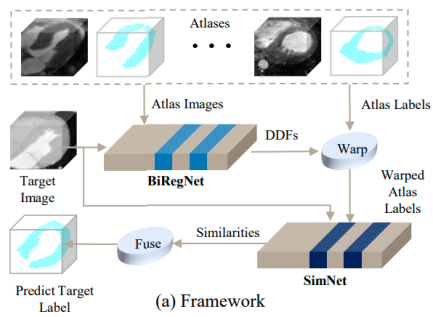 该工作提出了一种多模态多图谱医学影像分割框架,其通过深度神经网络构建框架的图像配准和标签融合步骤,实现有效地多模态医学图像分割。