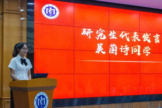 研究生代表吴茵诗同学分享了自己“缘起医大,缘续医大”的求学之路,她建议大家主动走出舒适区,合理规划学习时间,培养批判性思维,学会独立思考,期待和所有新同学一起在威廉希尔体育学有所获、学有所成,助力医学影像、智能医学高质量发展。