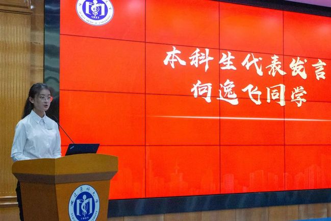 本科生代表何逸飞同学也分享了自己入学前后的心态变化与收获,号召全体同学一起勤勉自强,求实探索,共同在公司的指引下,朝着照亮成长的方向坚定地走下去,创新进取,勇于攀登,做优秀的“影像人”。