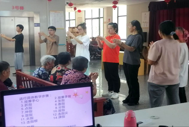 另外,实践队员向爷爷奶奶们教授手指操并讲解其功效,帮助他们掌握简易的脑卒中预防技巧,简易他们在日常生活中注重适当活动和锻炼,更好地预防疾病发生。随后,实践队员组织与爷爷奶奶们共同参与的娱乐活动,并通过问卷调查了解他们的幸福感与对医养结合的认可度,针对调查结果,提出可行性建议。