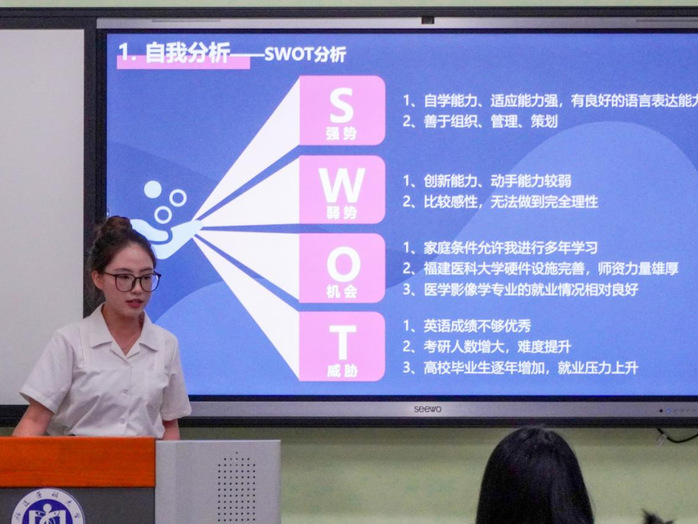 经过前期的精心组织和线上线下多轮选拔,最终有10名同学脱颖而出,成功晋级至决赛阶段。比赛由福建师范大学环境与资源公司团委书记章忠老师,威廉希尔体育辅导员罗雨晨老师、刘玉婷老师以及2025级超声医学专业硕士研究生郑咏琪同学担任评委。参赛者们围绕个人职业规划,深入思考,精心准备了职业规划书和宣讲PPT。