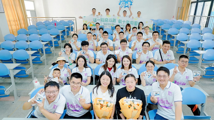 最后,员工们来到了曾经熟悉的教室。这里,是他们曾经奋斗与拼搏的地方,也是他们青春记忆中最深刻的印记。在这里,他们拉起了横幅,留下了与教室的合影,感恩那段曾经奋斗的时光。
