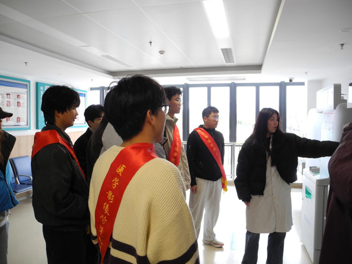 通过参观医院智慧门诊大厅,同学们深刻感受到科技赋能医疗带来的巨大便利。智能导诊系统和自助挂号机的应用,不仅提高医院的工作效率,也为患者提供更加便捷、高效、舒适的就医体验。在院方详细讲解之后,部分同学们戴起志愿者绶带,用行动传递温暖,为前来就诊的老年人讲解挂号、缴费等操作,对于行动不便或需要特殊照顾的老年患者,更是提供“一对一”陪伴服务,全程陪同完成挂号、就诊、检查、取药等流程。通过此次活动,2024级智能医学工程专业班级的员工对医院智能设备以及设备使用情况更加了解,为之后专业学习与研究奠定实践基础。