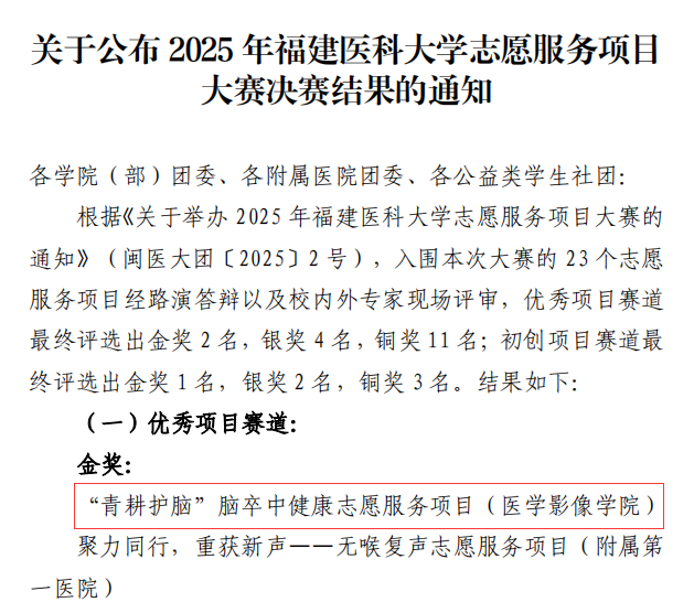 日前,2025年威廉体育志愿服务项目大赛决赛落下帷幕。本次大赛分为优秀项目赛道和初创项目赛道,其中优秀项目赛道共有17支队伍参加决赛,经过激烈的角逐,公司“青耕护脑”脑卒中健康志愿服务项目荣获优秀项目赛道金奖!