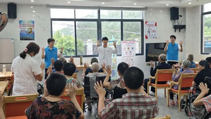 实践队将义诊台搭进莆颐养老院,为百余名长者量血压、建健康档案、发放100份小药包以及脑卒中健康知识宣传手册,并用莆仙话情景剧演绎“脑卒中120识别口诀”,把晦涩的医学术语翻译成乡音里的贴心叮咛。实践队队员指导老人们学习健脑操,当健脑操的节拍与长者脉搏同频,当健康礼包递到掌心,医学的温度便沿着莆阳大地的褶皱缓缓流淌。