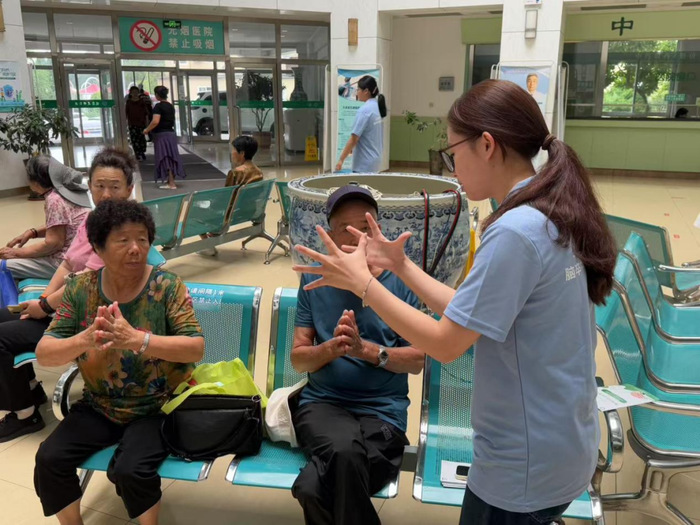 次日清晨,4名带队老师,2名省级卒中防治专家、11名员工志愿者组成“义诊+科普”实践队,奔赴大连金石滩医院开展志愿服务活动。在义诊区,专家与员工志愿者分工合作,专家们细致解答着居民的健康疑问,针对高血压、高血脂等高危人群提供个性化的健康指导,员工志愿者贴心为居民量血压,做好健康记录。在医院休息区、病房内,员工志愿们积极行动发放脑卒中科普手册,将复杂的医学知识转化成简单易懂的语言传递给现场观众们。公司志愿者余诗瑶同学指导老人们学习健脑手指操,在现场得到热烈反响,周围老人看到后都积极加入,学习并了解脑卒中识别及急救等知识。这场服务与成长并行的实践,为基层卒中防治网络织密了青春经纬。