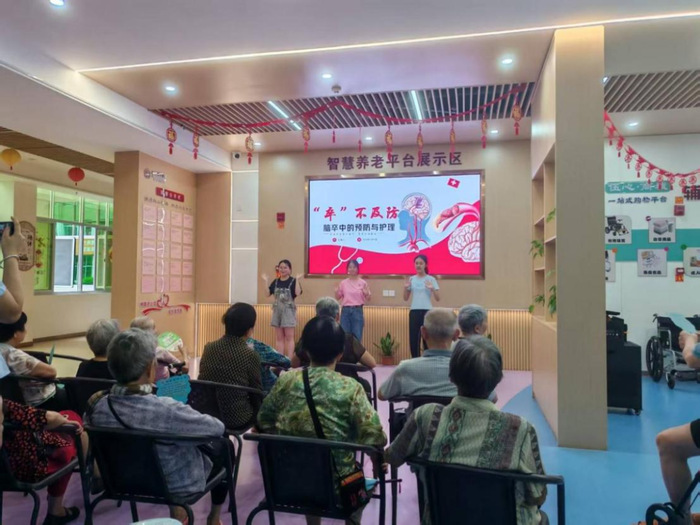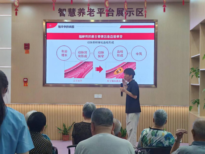 队员们用通俗易懂的语言向老人们科普脑卒中的危害和预防方法。老人们听得十分认真,不时提出问题,队员们都一一耐心解答。队员们还为老人们准备一些简单的康复训练,帮助他们活动身体,增强体质。