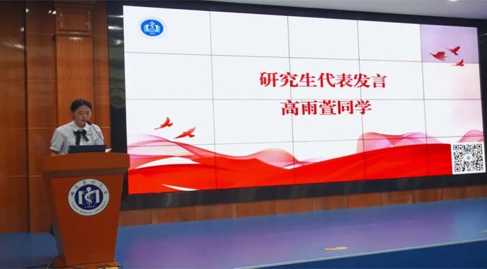 研究生新生代表高雨萱同学分享了她从“老生”到研究生“新生”的身份转变,从初入大学的手忙脚乱到如今从容前行的蜕变历程,讲述了在专业学习、学科竞赛、素质提升等方面的感悟,以及对研究生阶段的美好展望,号召研究生在科研道路上相互扶持、共同进步。