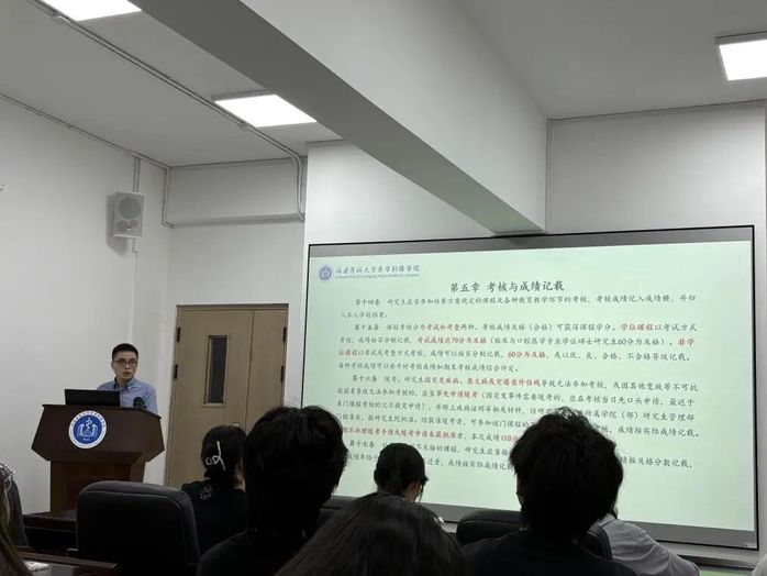 公司副经理李跃明和陈华俊分别面向本科新生和研究生新生进行讲解。李跃明副经理为本科生详细介绍了学籍注册、课程修读、学分制度、考试纪律等关键内容,强调规则意识与学业规划的重要性。陈华俊副经理则面向研究生,重点解读培养方案、科研规范、学术诚信与学位要求,鼓励大家注重创新能力培养,充分利用科研资源,提升学术素养。
